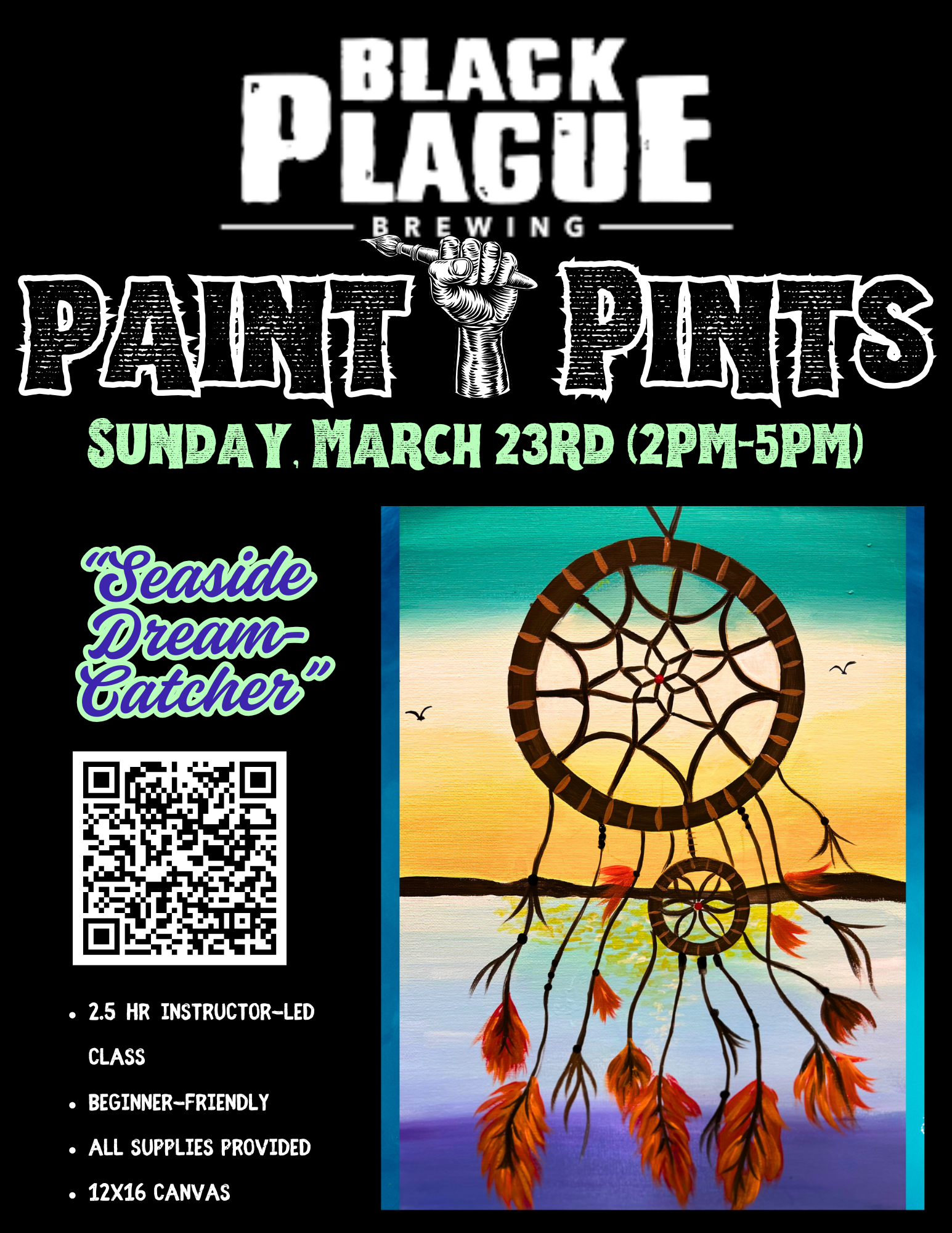 Join us at Black Plague Brewery for our upcoming Paint and Sip event! Local artists will lead you through each step as you create your own version of “Seaside Dream-Catcher.” Enjoy your favorite pint while unleashing your creativity alongside friends and family.