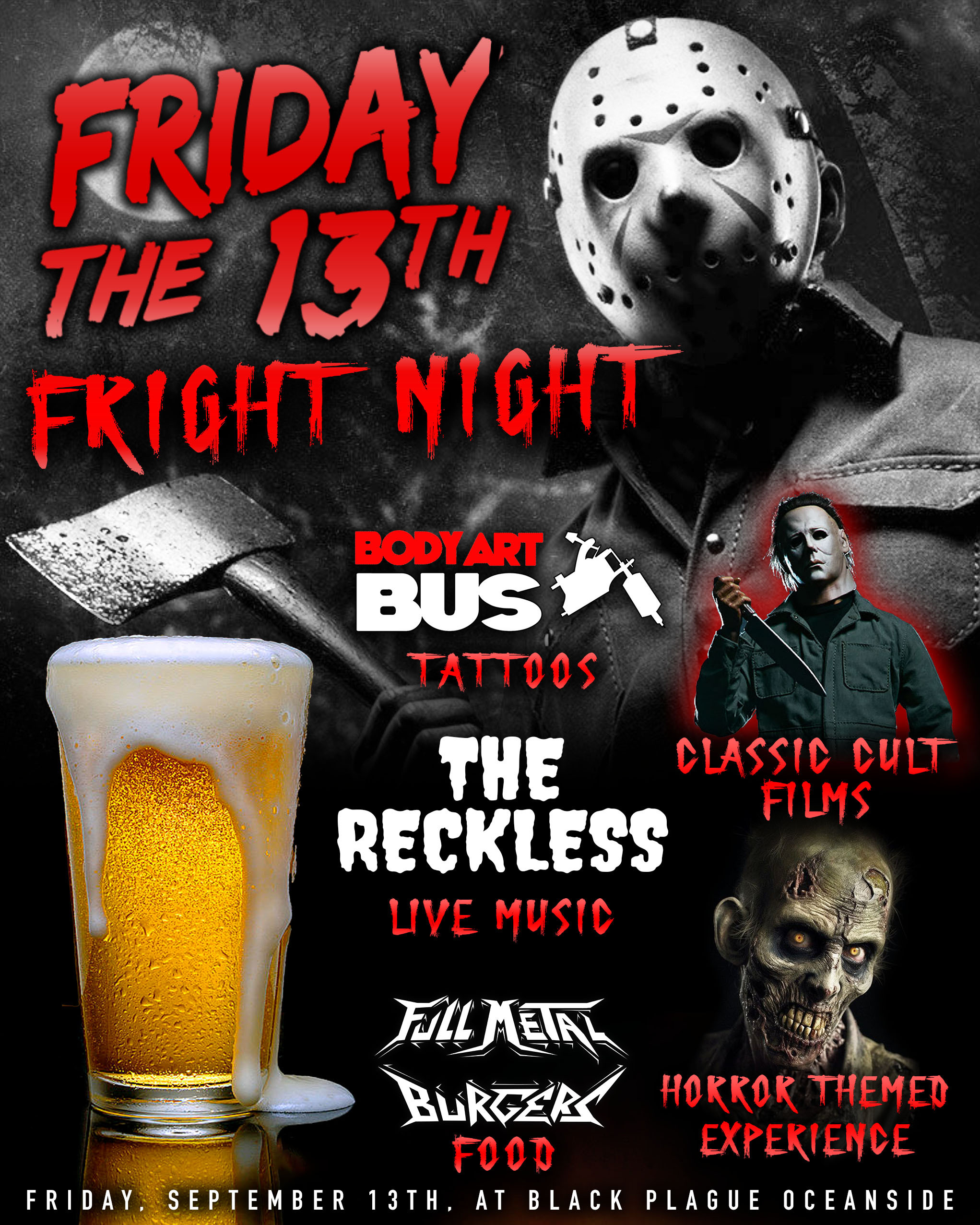 On Friday, September 13th, prepare yourself for a night of thrills, chills, and killer good times at Black Plague Brewing’s Oceanside Brewpub! We’re bringing the ultimate spooky vibes with a lineup that’ll make this Friday the 13th one to remember.