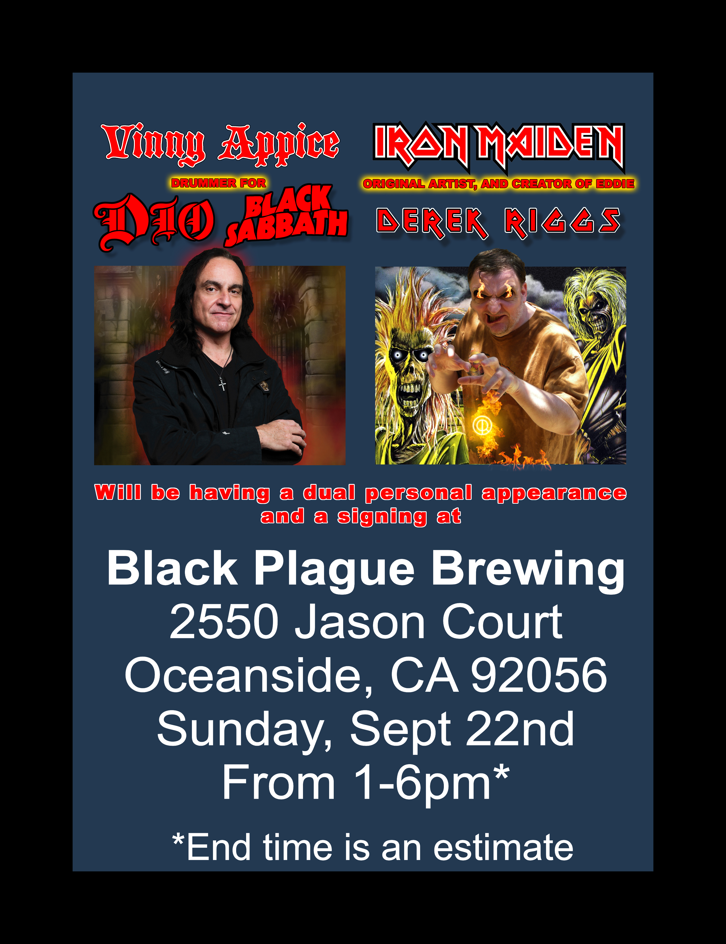 On September 22nd, get ready for an unforgettable day at Black Plague Brewing’s Oceanside taproom as we host a very special guest signing event featuring two icons of rock and metal: Derek Riggs of Iron Maiden fame and Vinny Appice of Black Sabbath and Dio!