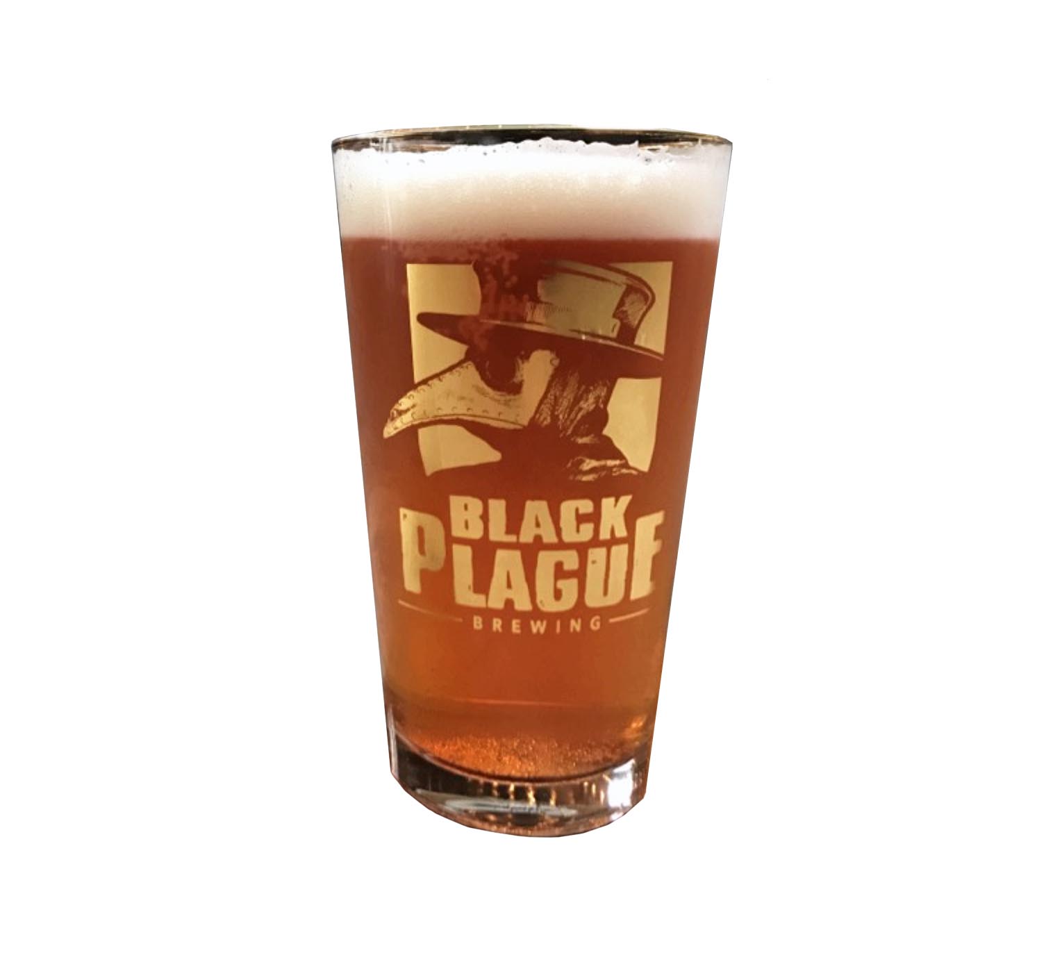 Premium 16oz pint glass featuring bright gold Plague Doctor logo.